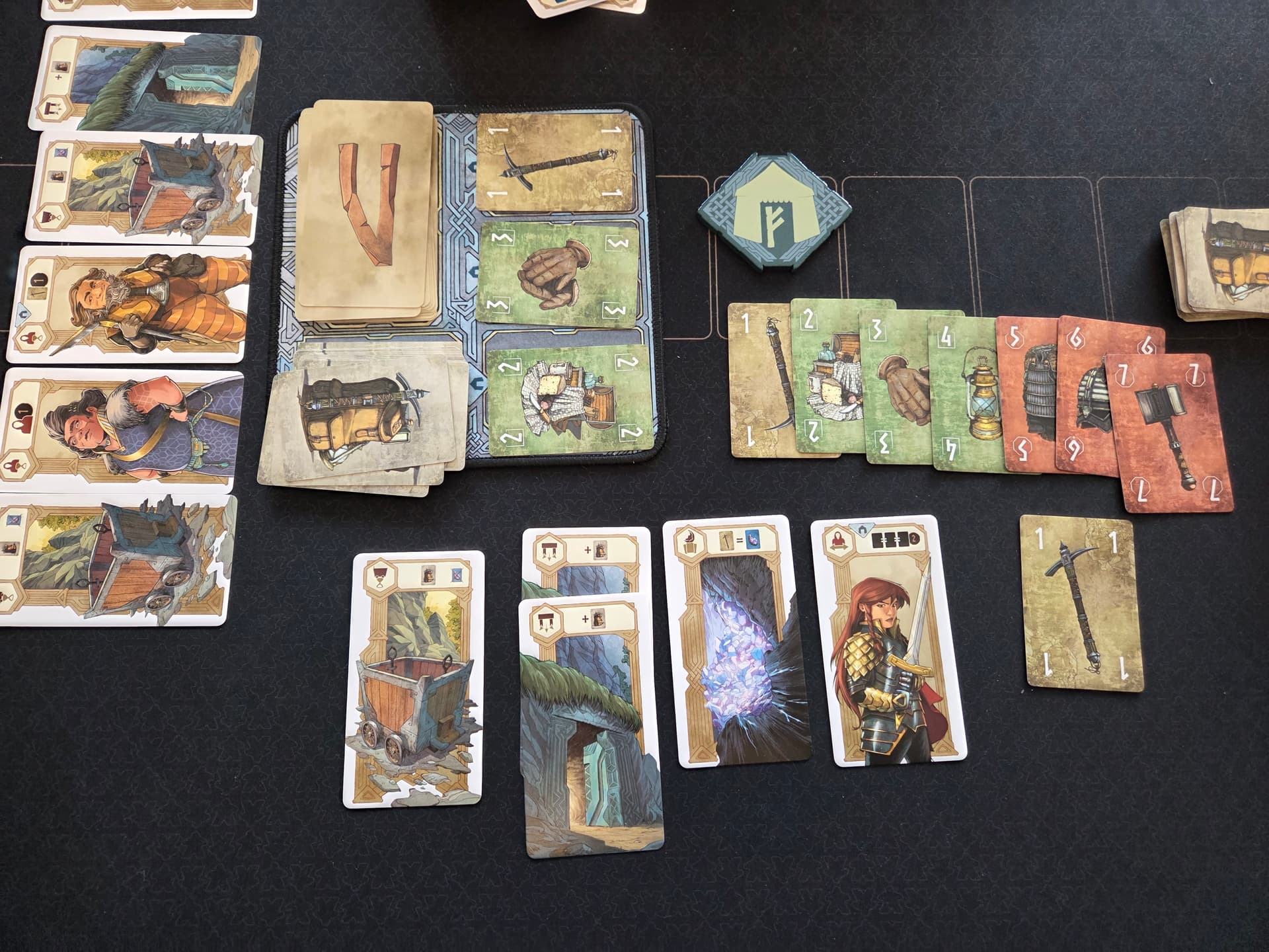 à 4. Je l’emporte grâce à une qualité constante de mes cartes. On essaye de me bloquer à la fin en prenant des marteaux, car les deux prochains me rapporteraient chacun 10 pts, mais ça ne suffira pas (jouez pour vous avant de bloquer les autres !