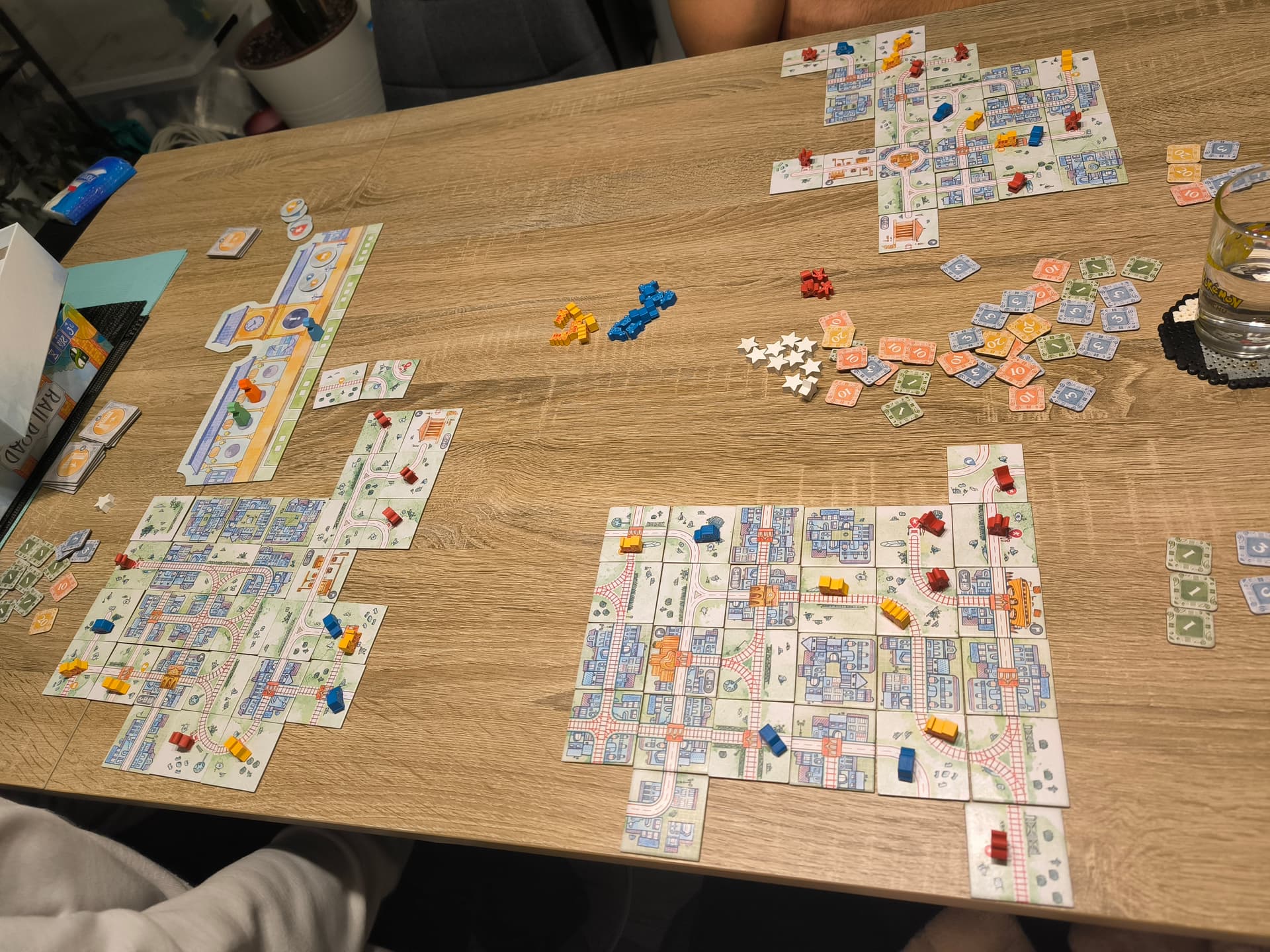 On a refait une partie de Railroad tiles, avec ma mère. Vous pouvez observer le beau plateau bien rectangulaire que j’ai fait. Par contre, le nombre de sorties qui fait - 1… Outch. On était premiers à égalité (74 pts) avec monsieur, et ma mère derrière (54 pts).
