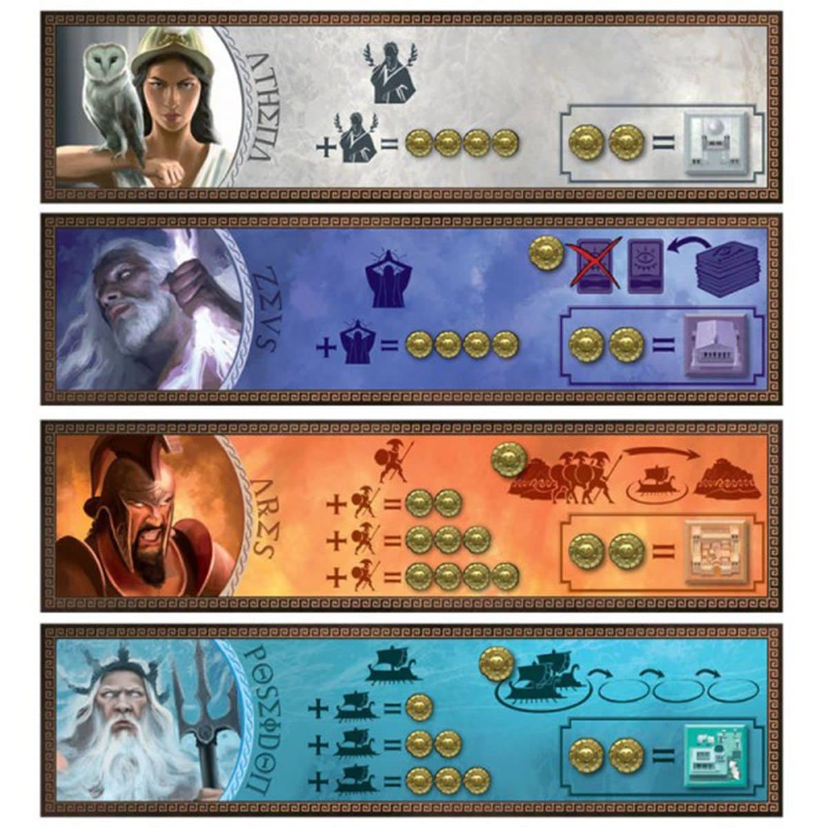 Les illustrations, on va dire que c’est une histoire de goût, mais je les trouve bcp plus mainstream / japonisantes que les premières, plus proche du canon de la mythologie grecque - je mets de côté les illus de la map modulaire qui sont très chouettes mais les cornes d’abondance ne sont pas forcément ultra lisibles. C’est la corvée de les compter lors de la phase de revenu.