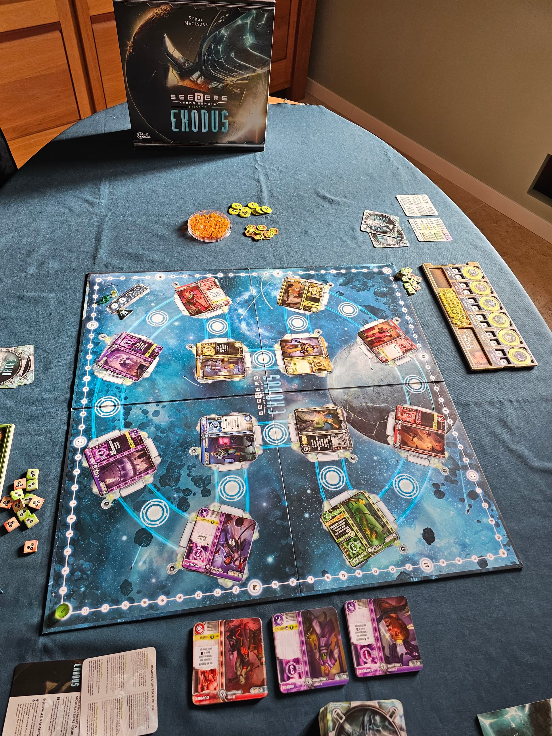 Seeders exodus : à deux joueurs, une heure et demie de partie et c’était pas mal du tout. Mais, ce qui le pénalise, à mon humble opinion, c’est cette phase d’action où l’on pose les cartes et où l’on combotte. C’est séquentiel : un joueur fait toutes ses actions, puis le suivant, etc. Je n’ose pas imaginer le temps d’attente à quatre joueurs… très beau matos et lore présent et bien intégré.