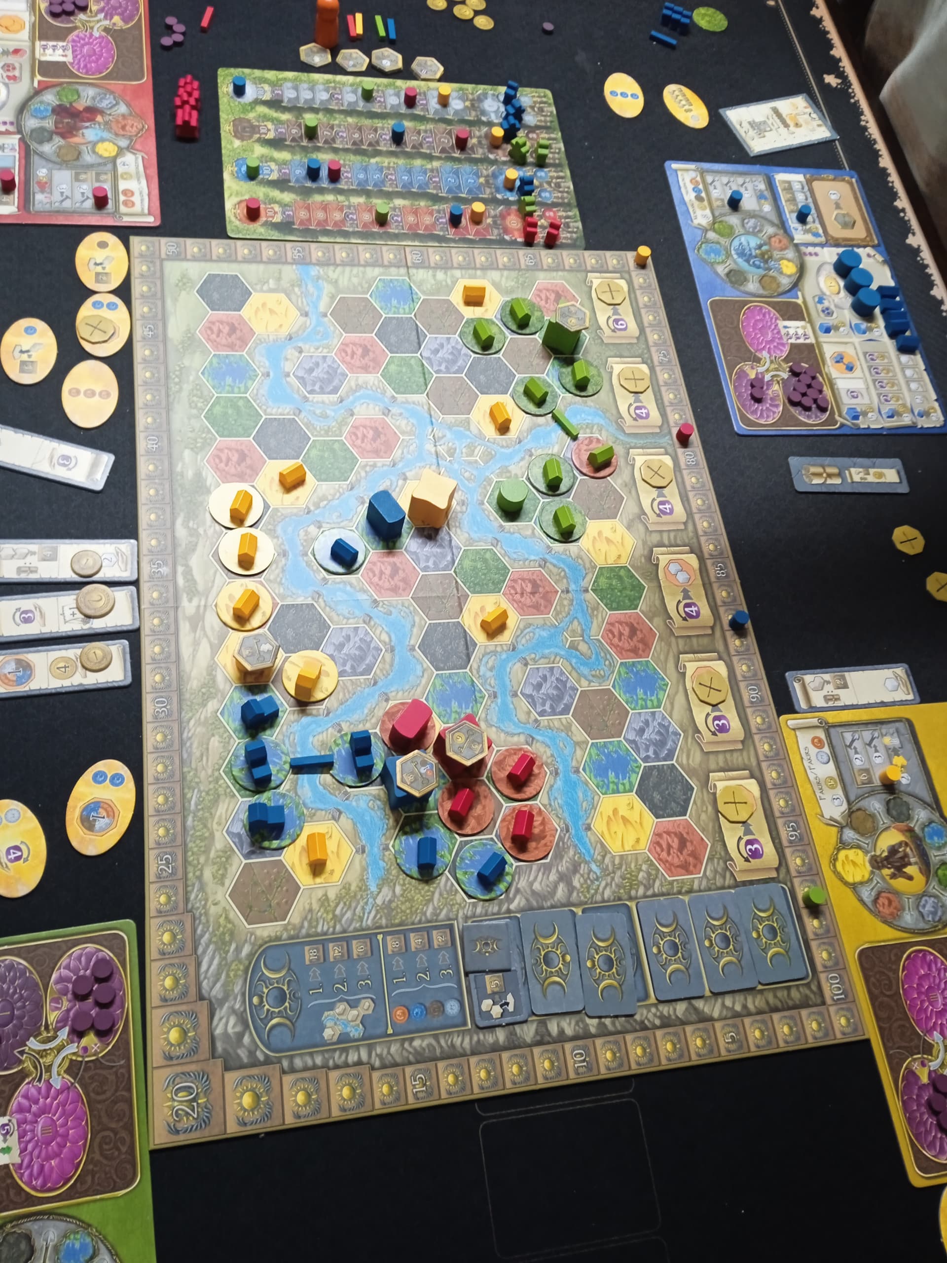 Jai joué les aurens (verts) ce qui me permet de m’assurer des bonnes places sur les pistes de religion avec le chateau construit rapidement. Je suis un peu dans mon coin, donc pas beaucoup d’argent en début de partie. Les jaunes “tapis volants” et les rouges “magiciens des ténèbres” ne disputent pas trop la majorité sur les territoires, ce qui fait que même si je suis un peu derrière au score, je passe finalement devant.