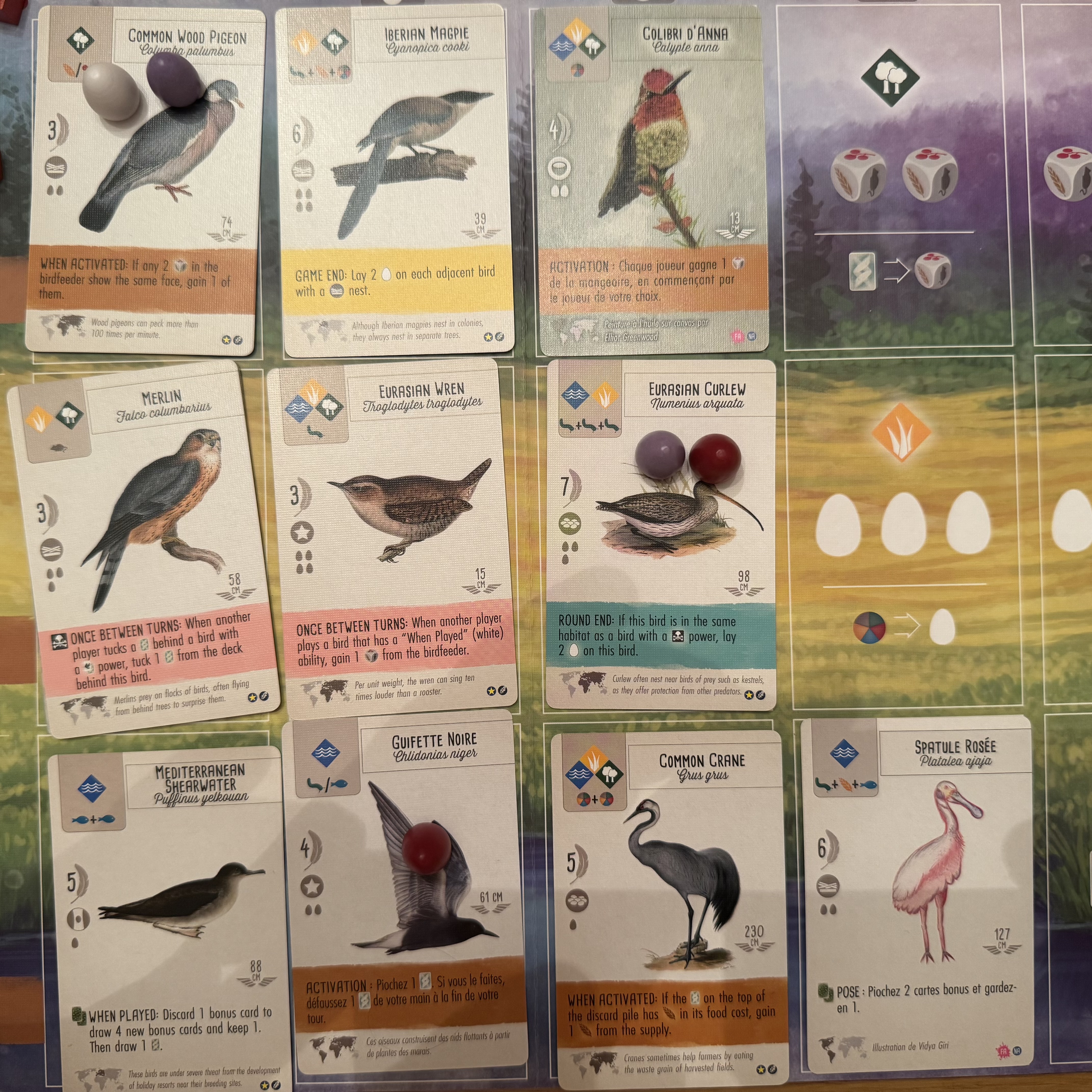 J’ai aussi pas mal joué avec les cartes dont l’effet offre des cartes bonus pcq j’avais une carte bonus qui m’offrait des points pour ce type d’oiseau et c’était plutôt intéressant sur le score final.