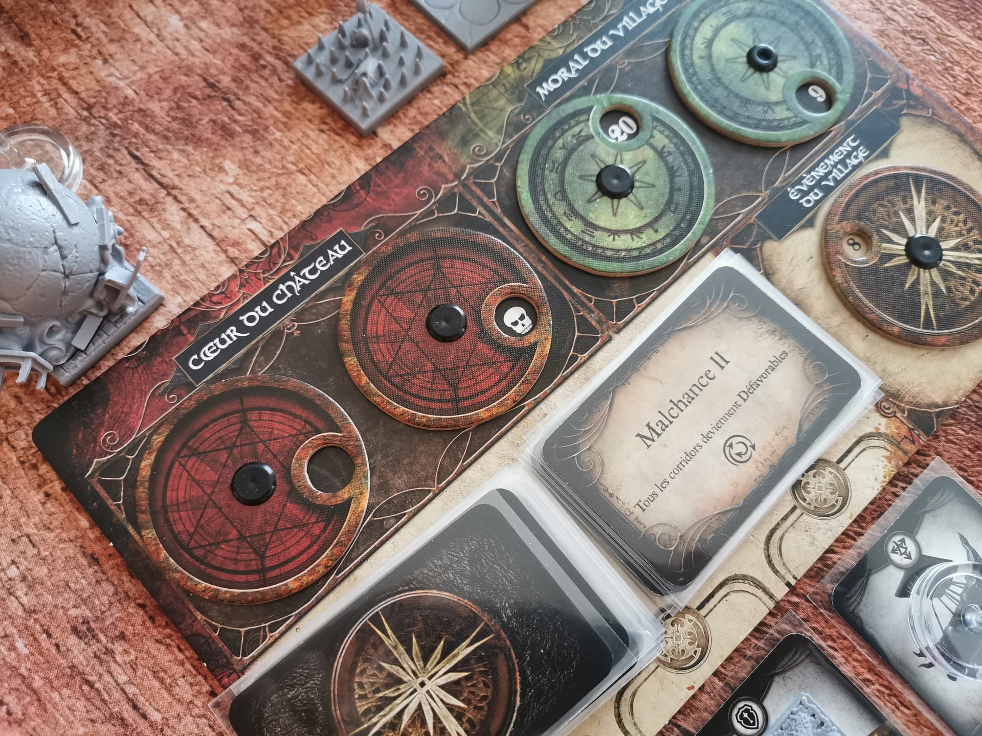 Très bonne partie très agréable. Les règles sont simples et fluides, c’est du classique. Les “familles” de cartes à acheter sont très intéressantes avec leurs synergies propres. Je pars sur un petit mix avec comme base les “malices” qui permettent d’assassiner, et celles qui permettent de promouvoir, pour garder une taille de deck raisonnable. Il me manque un peu de présence sur la carte, mais j’assassine tous ceux qui s’approchent un peu trop près (16 trophées en fin de partie). C’est le propriétaire du jeu qui décide de mettre fin aux hostilités en déployant ses dernières troupes, même s’il se sent derrière… Dommage mon deck commençait à vraiment bien tourner.