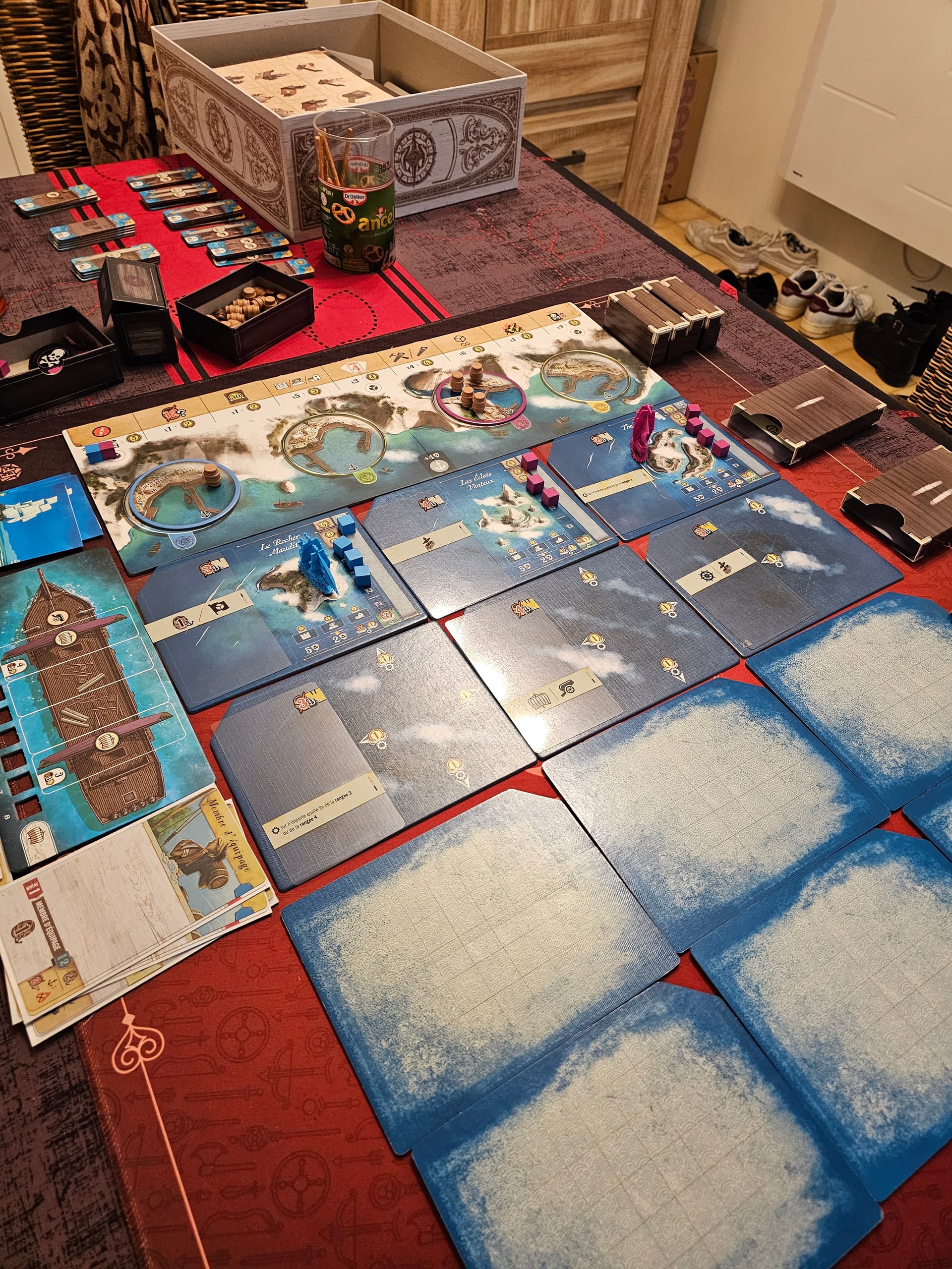 Dead Reckoning un solo de 2h30 quand même. Mécaniques très modernes, très plaisantes, possibilité de faire des tours rapides, contrairement à mes craintes. À voir avec un joueur qui fait de l’AP. Sorti de l’aspect mécanique, si le thème est bien présent, on reste sur l’eurogame, à fight certes, mais de l’eurogame. Qui avait osé le terme eurotrash ? Bref, Fortunes de Mer a encore de belles heures devant lui. Hâte de l’essayer en multi.