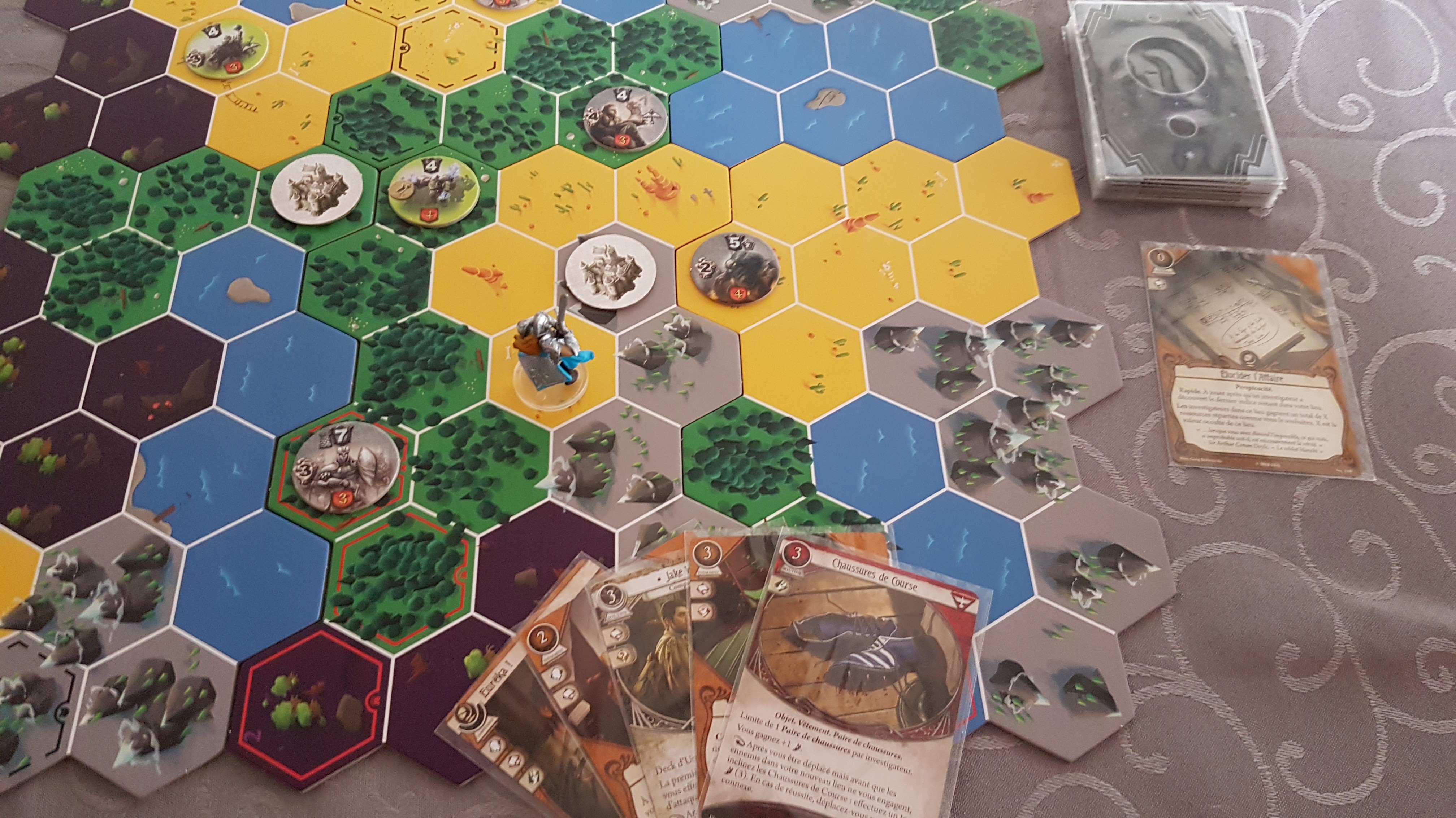 En même temps il faudrait avancer sur le plateau modulaire semé d’embûches (différents pièges) et avec des coûts de déplacements différents façon Mage Knight suivant le type de case (montagne, plaine, marais, eau, désert…) et nos cartes permettraient d’avancer bien sûr mais aussi de réussir ces test d’embûches. Au final il faudrait arriver à se placer sur la bonne case du plateau pour valider la réponse (à valider dans l’appli une fois sur la case qu’on pense être la bonne).