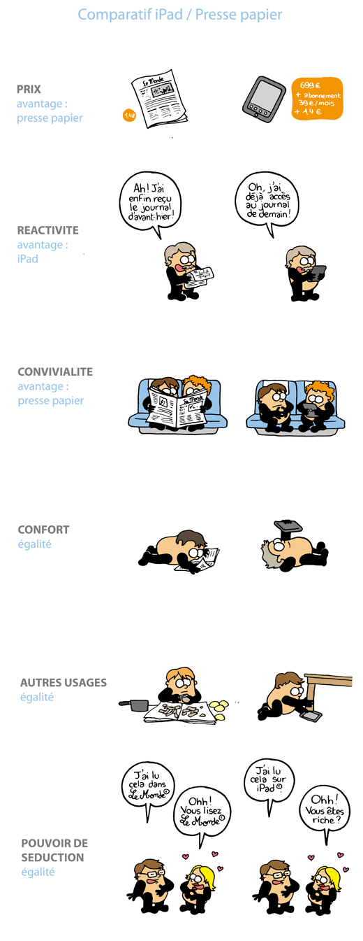 Moi ce qui m’énerve le plus finalement, avec l’ipad, c’est que tout le monde en parle alors que ya franchement pas de quoi. Comme toujours Apple sort des produits déjà dépassés technologiquement, et plus cher que la concurrence, et qui enferme l’utilisateur dans un schéma payant s’il veut pouvoir évoluer avec son bidule.