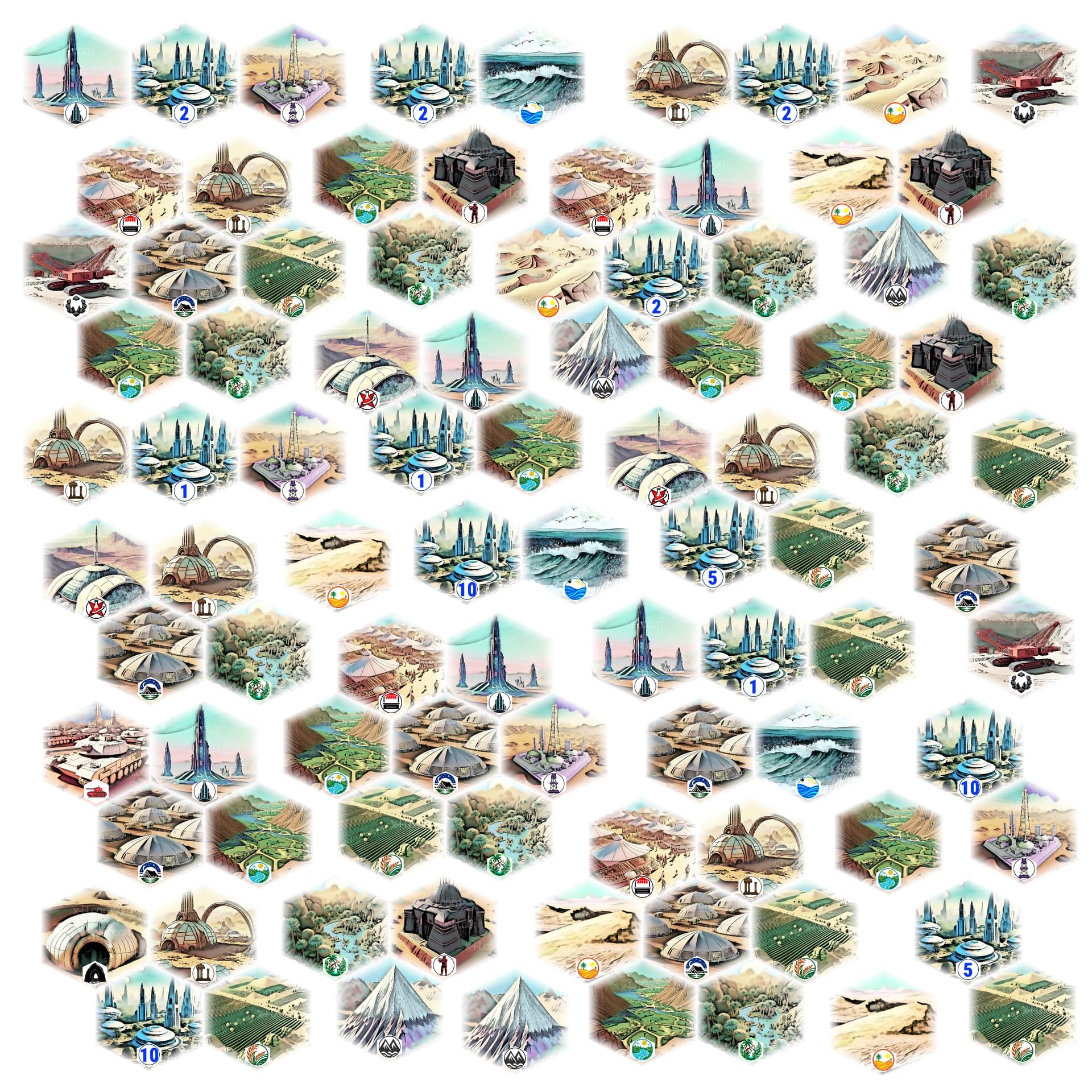 Ces tuiles peuvent avoir la taille d’1 hexagone / 2 hexa / 3 hexa / 4 hexa / 7 hexa .