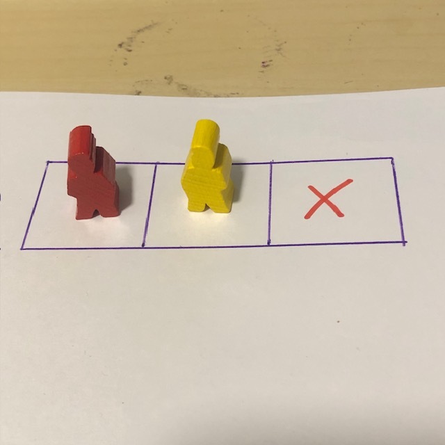 Rouge souhaite se déplacer sur la case marquée d’une croix rouge. Mais pour cela il va devoir d’abord passer par la case où se trouve le joueur Jaune. A ce moment Jaune va avoir deux choix : soit il laisse passer Rouge, soit il déclenche un conflit.