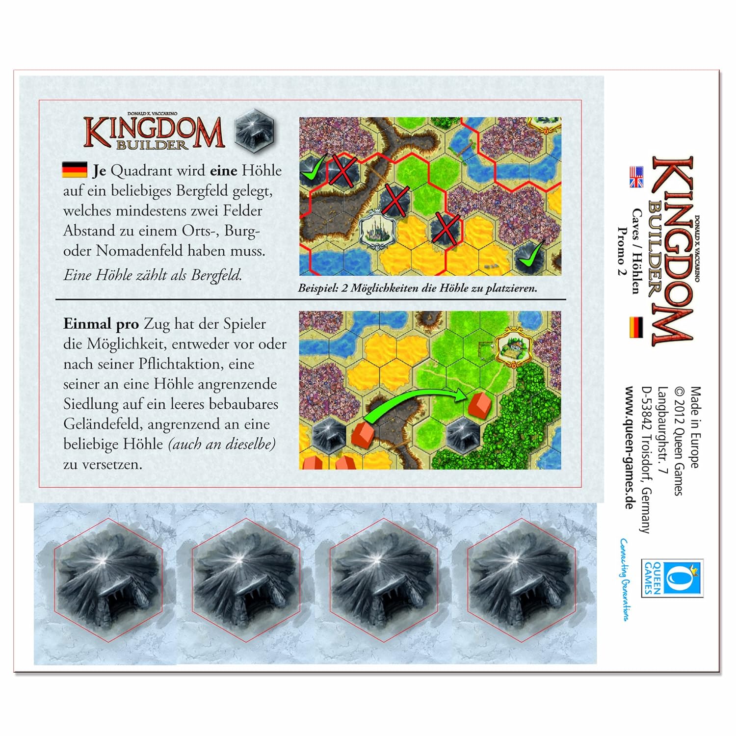 Kingdom Builder: Caves, a promotional item from Queen Games for Spiel 2012, consists of four cave tiles and rules.