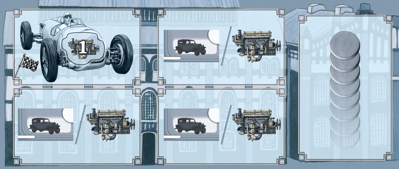 en + de chaque action, le J. peut finir son tour en plaçant au Marché (6 emplacements à 4J) une voiture + 1 moteur + 1 ouvrier (ou+) en choisissant un jeton (PV) dispo au marché de la manche en cours.