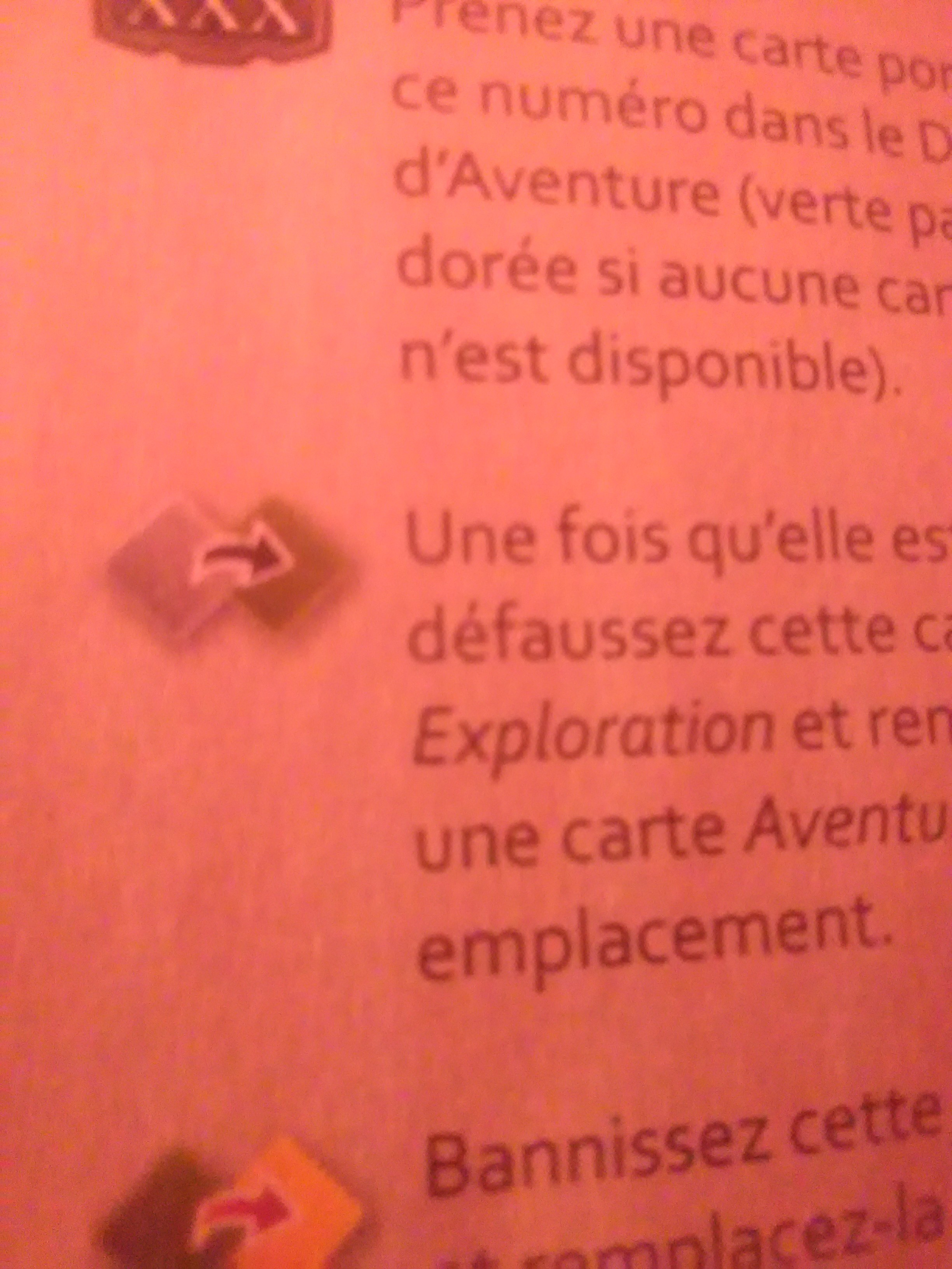 A moins que tu ne veuilles parler d’un événement qui contient l’icône de la 1ère photo postée… Ce qui nous renvoi au point de règle déjà évoqué : Lorsque tu résouds “l’événement (?)” en question, qui doit être une carte “exploration” avec un dos gris, tu le remplaces par la carte à dos vert (carte “aventure”) dont le numéro sera celui indiqué par la flèche orange qui pointe sur “l’événement” en question.