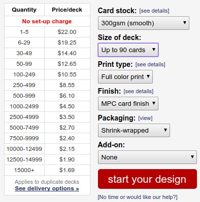 Pour montrer à quel point ces économies d'échelle peuvent être importantes, j'ai simulé la création d'un deck de 90 cartes carrées chez un prestataire spécialisé.