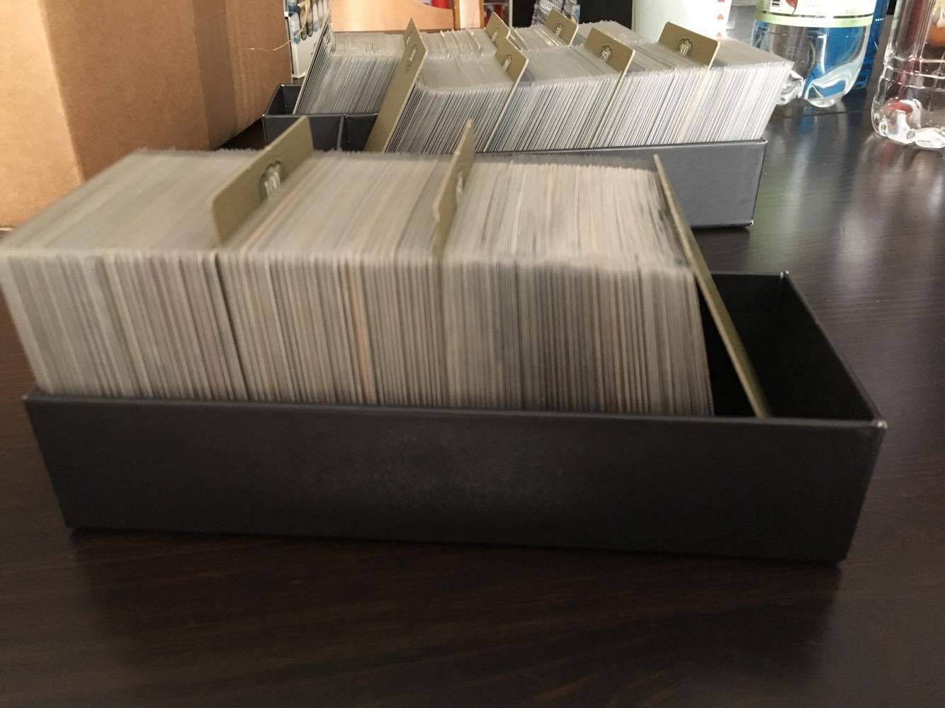 Donc 5 casiers pour 1400 cartes sleevées (je ne compte pas les intercalaires), ça colle (tout juste, 280 cartes/casiers). On va en avoir 250 en plus avec les extensions, plus les SG (100 cartes à ce jour), plus les éventuels add-ons. Ca risque de faire juste.