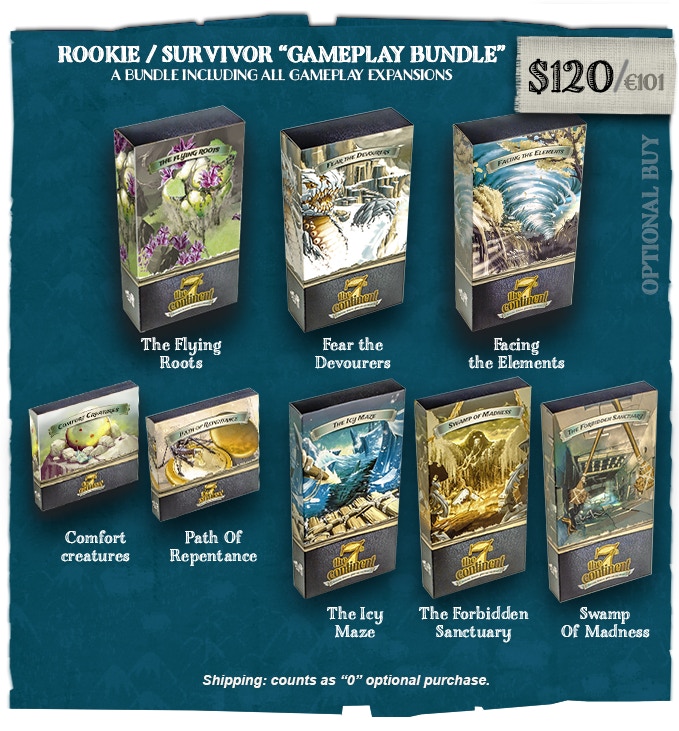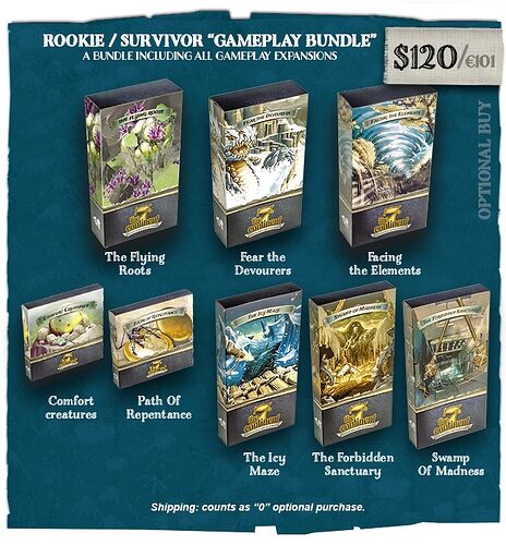 Concernant le Rookie / Survivor Gameplay Bundle à 120$, qui contient toutes les extensions, il est écrit en bas de l’image :