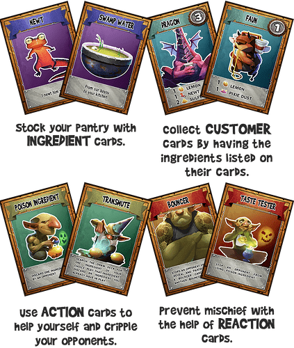 A take-that style card game for ages 9+ where players collect ingredients to attract customers and earn points to win.