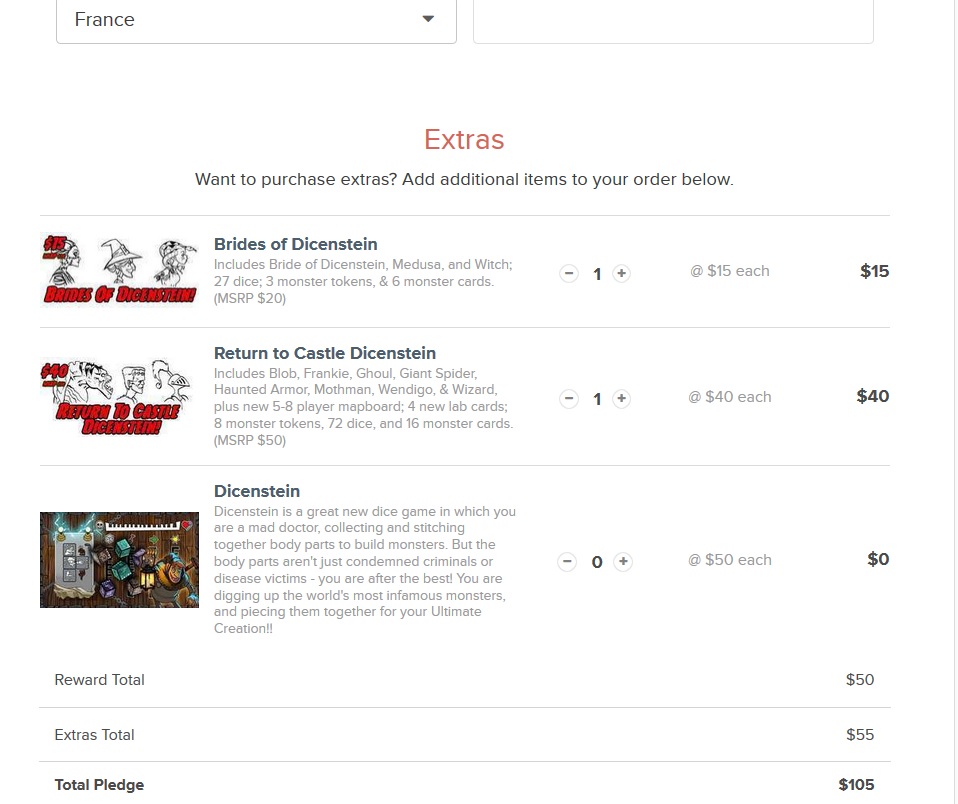 Mise à jour de la page KS : en cliquant $50 on arrive là : https://app.crowdox.com/projects/181668 … /calculate We will charge shipping costs after the Kickstarter concludes, based on the actual prices we incur. We collect this through our pledge manager post-campaign. Shipping prices vary hugely around the world, and this way we can customize costs per customer, which lets us offer more stretch goals & add-ons. The final price is based on how many backers we get from each part of the world (the more per country, the cheaper it gets for us to ship there). We realize uncertainty is not always pleasant, and we vow to update and clarify the shipping prices as soon as humanly possible. The core game will likely ship in the neighborhood of $10 to $15 for US, Canada and EU. In other places it could rise to $20 or more. The game box will be about 10"x10", meaning the box it ships in will actually be larger. Our estimate weight is about 3 lbs., also meaning the box it ships in will be very slightly heavier. These factors, and the number of backers from your country or region dictates the shipping prices. Actual charges will be assessed after the campaign ends, and charged through our CrowdOx pledge management system. Also note that while we have tried to get the firmest answer possible for the game’s release, unexpected delays are, by definition, unexpected. Pour un pledge à $50 + les deux add-on :