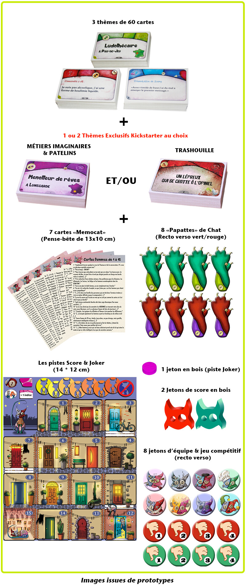 Dans la lignée de Dixit ou de Linq, il s’agit d’un party-game d’échange d’idées, ou logique et extrapolations d’idées vont de pair, décliné sur 3 thèmes, et 6 add-on thématiques, toutes sur un mode verbal.