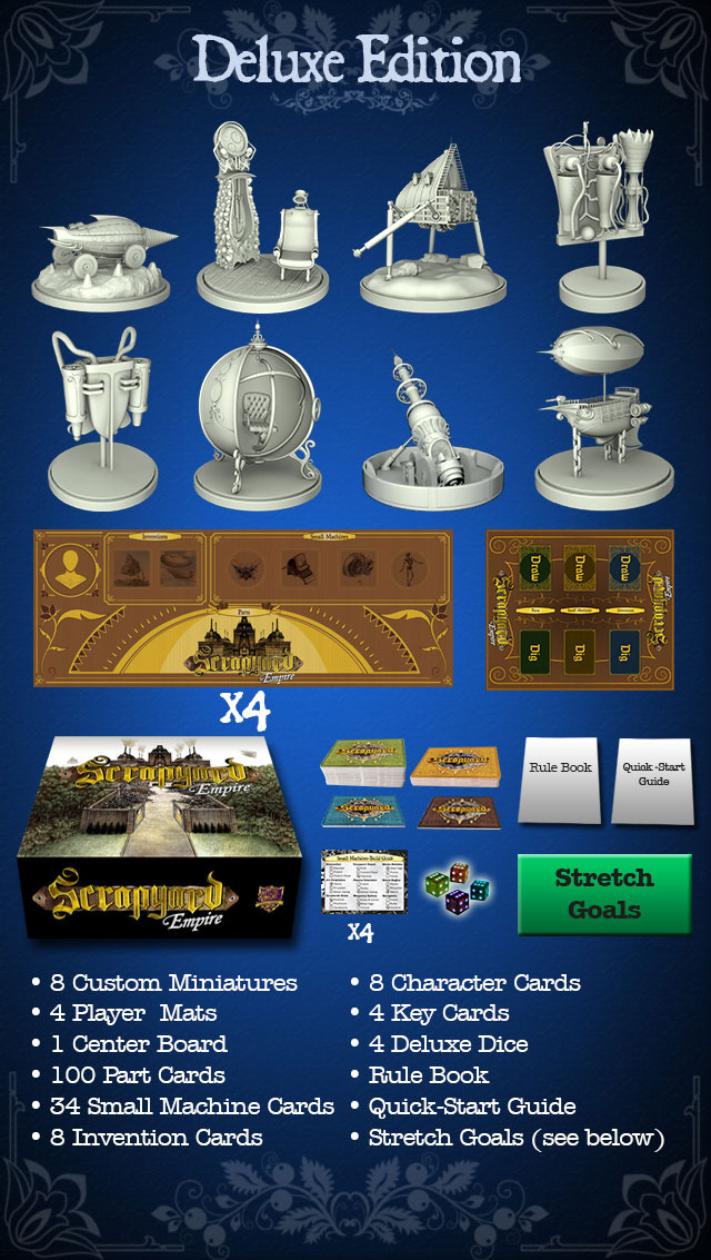 Les miniatures représentent les inventions devant être construite et ne fond pas partie intégrante du jeu mais elle permettent de se plonger au maximum dans l’univers Steampunk.