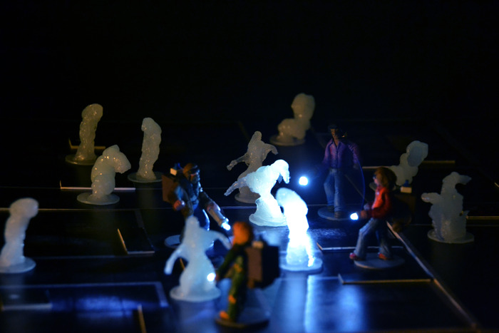 Là on a affaire a un OVNI… un jeu qui se joue dans le noir, les figs ont des lampes torches (suffisantes a priori pour eclairer les cartes autour, sinon tu prends une fig pour t’éclairer dixit l’auteur), des extraits videos accessibles avec des QR codes sur un mobile (ou sur un dvd mais mois sexy)… une jolie vidéo bien stressante en exemple…