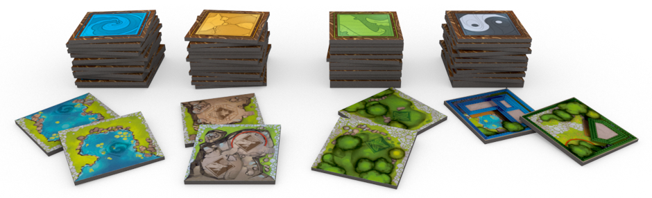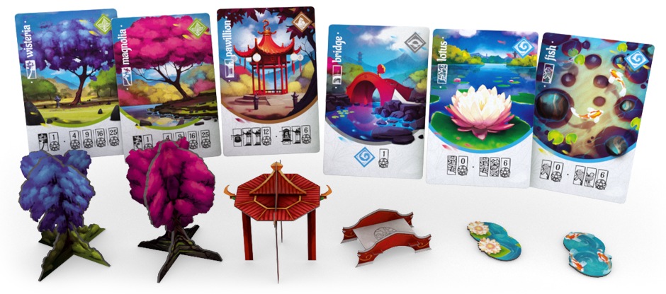 Dans le jeu, les tuiles de jardin reproduisent vraiment cet aspect. Lors de chaque tour, l’une des actions possibles pour les joueurs sera d’étendre le jardin horizontalement avec différents types de terrain: eau, roches, végétation et chemins. Quand une tuile est placée sur le plateau, pour chaque élément correspondant, les joueurs obtiennent des bonus et avance sur son plateau joueur.