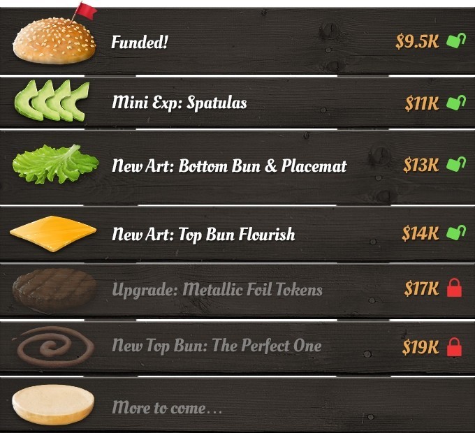 Ils ont ajouté dans la foulée un nouveau stretch goal qui augmente le nombre de burger à réaliser pour marquer des points (top bun). Il manque encore 1600$ et il reste 25j pour débloquer les pièces en métal.