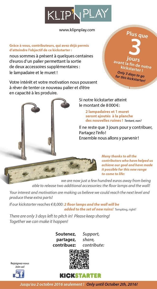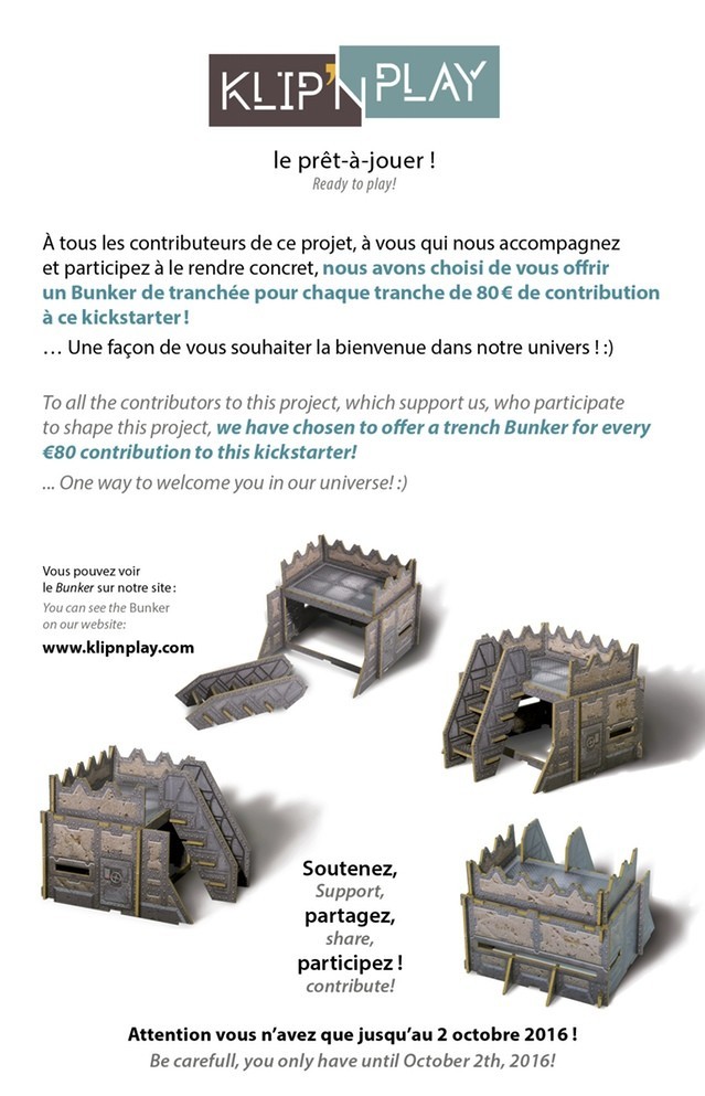 Update n°2: Possibilité de se faire livrer en relais colis ce qui permet de faire encore baisser les frais de port et ajout d’un bunker en cadeau pour chaque tranche de 80€ investit dans le projet.