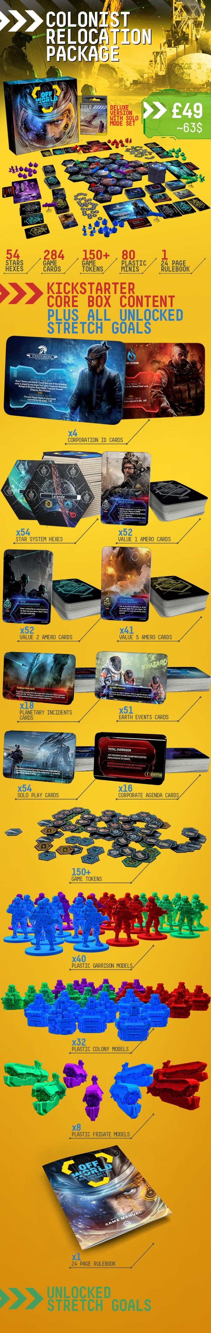Jeu de plateau futuriste, Off Wolrd se veut un 4X (eXplore, eXploit, eXpand, eXterminate) de 1 à 4 joueurs (5 et 6 joueurs pourront être débloqués pendant la campagne.