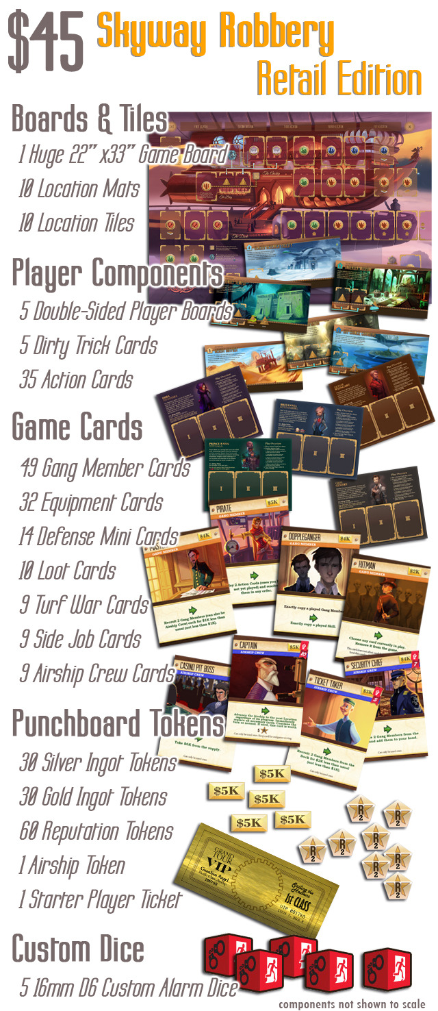 Pour les autres, voici un jeu qui me plaît bien pour son design, pour son thème et pour les différentes opportunités de jeu qu’il offre. Il est signé par le co-auteur de Fidelitas, Philip DuBarry. Il se joue de 2 à 5 joueurs, pour des parties de 90 minutes. Voici le lien: https://www.kickstarter.com/projects/ph … ?ref=users Il est possible de regarder une vidéo de Undead Viking pour mieux connaître le jeu. Depuis peu, ils ont réussi à diminuer les frais de port pour l’EU et le Canada. Le jeu sera aussi livré de l’Angleterre. Dans le jeu, nous représentons un gang de voleurs qui sévit dans un dirigeable. Nous devons tenter de réussir différents larcins pour obtenir des butins de qualité et ainsi augmenter notre réputation. Le jeu contient environ 200 cartes, un immense plateau représentant un dirigeable, des grandes cartes pour les différents lieux que nous visitons, 5 dés «customs» et des plateaux individuels pour les joueurs. Personnellement, j’aime beaucoup le style graphique du jeu. Voici d’ailleurs quelques exemples: