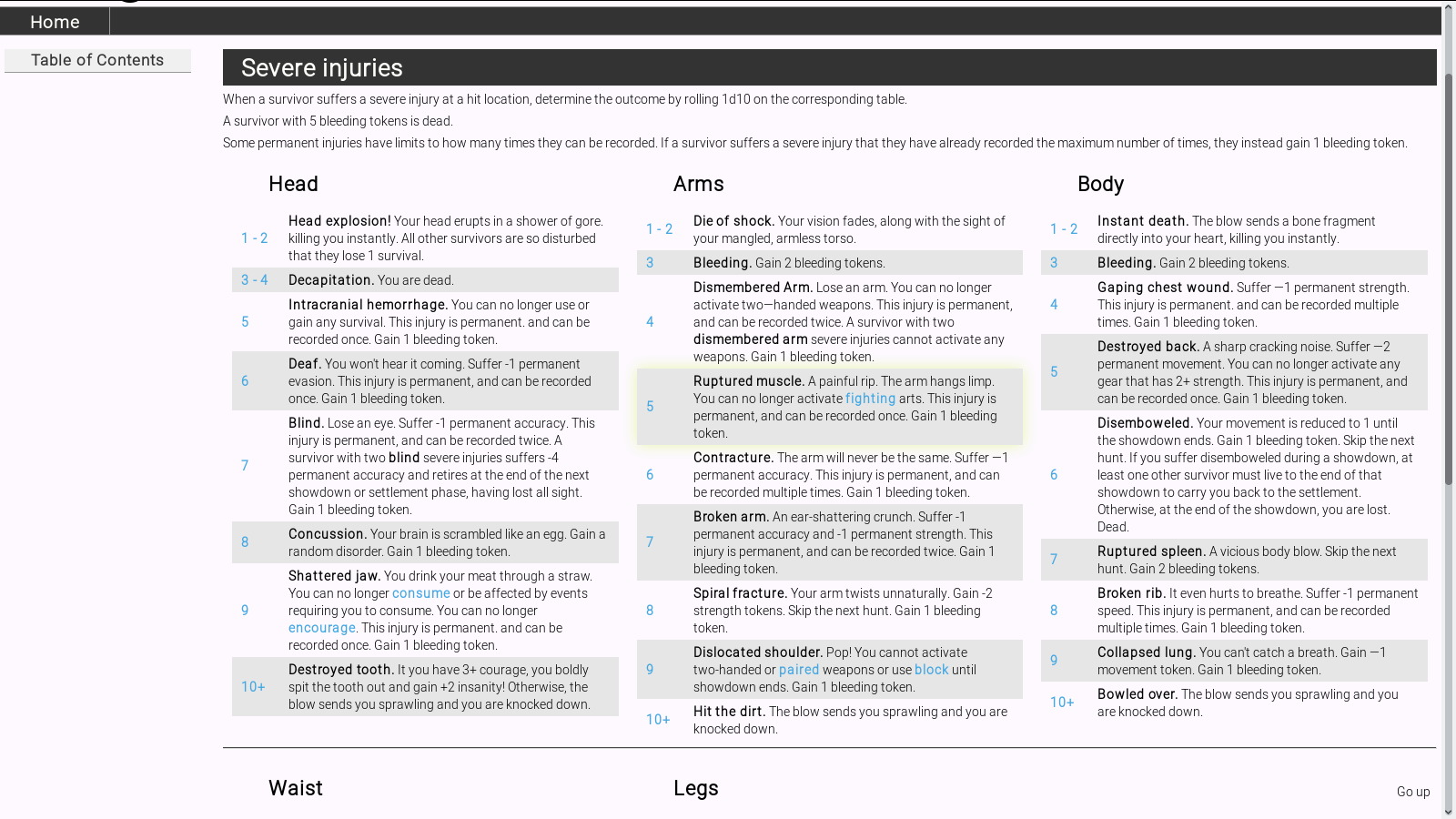 Pour ceux intéressés, j’ai fini de faire une version numérique des règle de base (j’ai fini la table de severe injury et brain trauma, donc page 91/228 pour le moment). Pour ceux intéressés, un petit mp et je vous donne accès à tout ça.