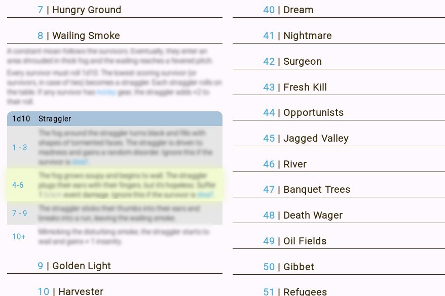 Toujours pour ma version numérique des règles, j’en suis à la table d’évènements de chasse, j’ai fait un petit truc simple mais pratique : de base, tous les événements sont cachés (sauf leur titre) et en cliquant dessus, on affiche ou masque l’événement qui nous intéresse. J’en suis à 80/100 (et je viens de passer le cap des 100 pages /228 !), c’est un peu fastidieux mais ça avance assez vite au final. Toujours pareil, pour ceux intéressés : MP. Par contre, je rentre dans la partie spoil de la campagne. Pour ceux qui ne veulent pas se spoil, il suffit de s’arrêter aux “core rules”. Il va falloir que j’améliore la navigation entre les parties aussi. pour l’instant, il faut tout le temps repasser par la table des matières pour changer, j’ai déjà mis quelques raccourcis dans le menu de gauche, mais ce n’est pas exhaustif.