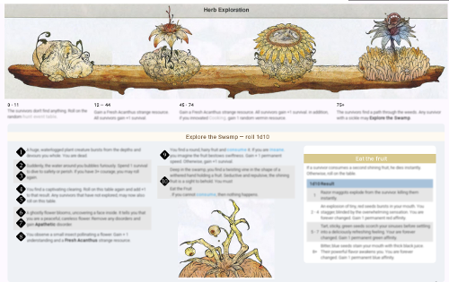 De mon côté, il me reste encore une vingtaine de double-pages à mettre en forme pour que la version numérique de la boîte de base soit finie. Au final, c’est plus long que je ne pensais de mettre en forme les story events, en particulier à cause de la mise en page carrément non triviale. Je fais de l’équivalent en HTML, mais forcément, c’est moins bien.