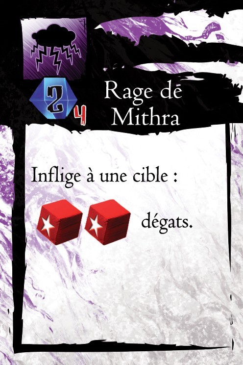 . Comme tu peux t'en apercevoir, Rage de Mithra n'est pas le seul sort de ma liste à ne pas être paru dans la king box et en SG, certains sorts on été modifiés. Ceci dit, ce qui peut prêter à confusion c'est que rage de Mithra figure dans les SG sur la page KS , à ce propos Monolith ont été généreux puisque nous avons eu droit à 35 cartes sort + 6 cartes supplémentaires dont les pouvoirs pourront être créés dans la règle spéciale d'un scénario fan-made par exemple.
