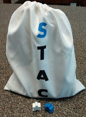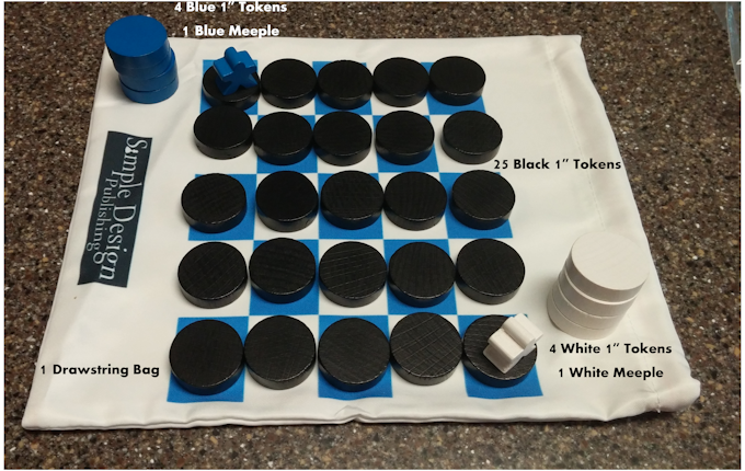 Each game comes in a drawstring bag that is printed on both sides. One side shows the name of the game and the other shows the game board and company logo. The logo will be updated with our new one before the bags are printed. The bag also doubles as the storage for the 33 tokens, 2 meeples, and rules sheet.