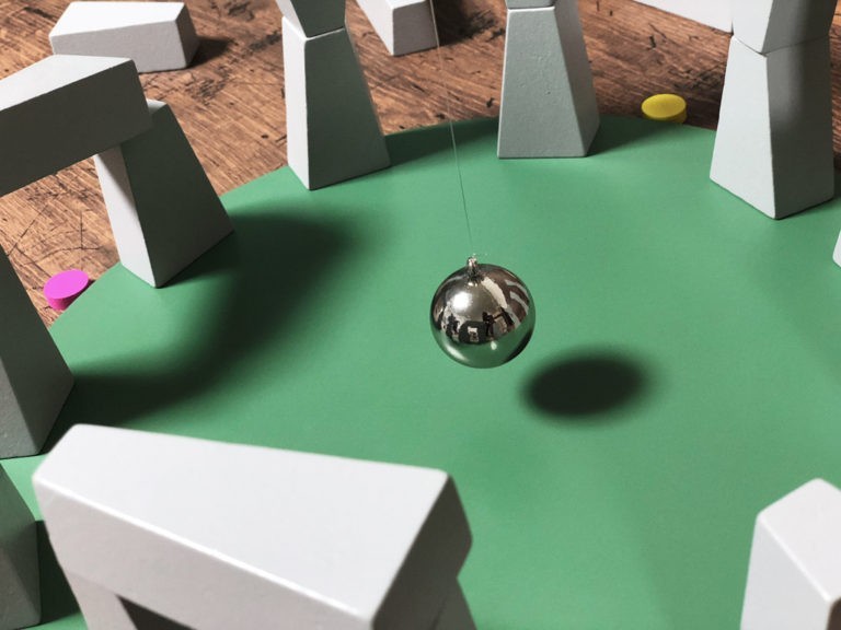 À chaque tour, les joueurs construisent une pierre et lancent la boule métallique d’un côté à l’autre de la base comme un pendule. Si vous pouvez passer la boule sans toucher les pierres, c’est un succès ! Mais si vous enlevez l’une des pierres déjà posées sur la base ou que vous poussez une pièce hors de la base, vous devrez prendre la pièce pour vous comme un point négatif. Si les joueurs ont fini de placer toutes les pierres, le jeu se termine. Celui qui a le moins de points négatifs gagnera la partie. Quelle sera la forme de Stonehenge à la fin de la partie ?