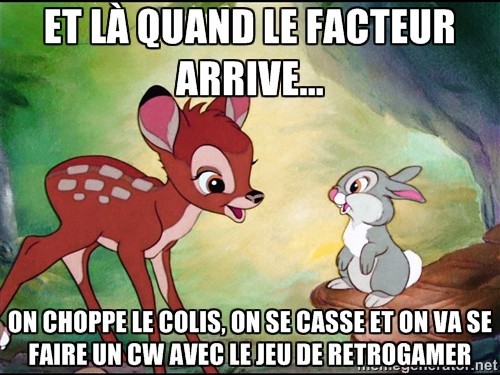 Je vais louer un déguisement de bambi pour aller camper dans le jardin de Retrogamer, moi aussi, et lui choper son colis quand le facteur passe... pas peur du taille haie moi....