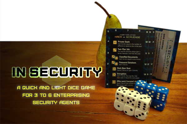 In Security is a light dice-rolling game for 3-6 players. I created it for a game design competition on Board Game Geek (where it won the Theme, Mechanics, and Design Quality categories, as well as the Grand Prize!). It’s super-quick to set up and explain, and takes just 15-20 minutes to play, so it’s a perfect little filler game!