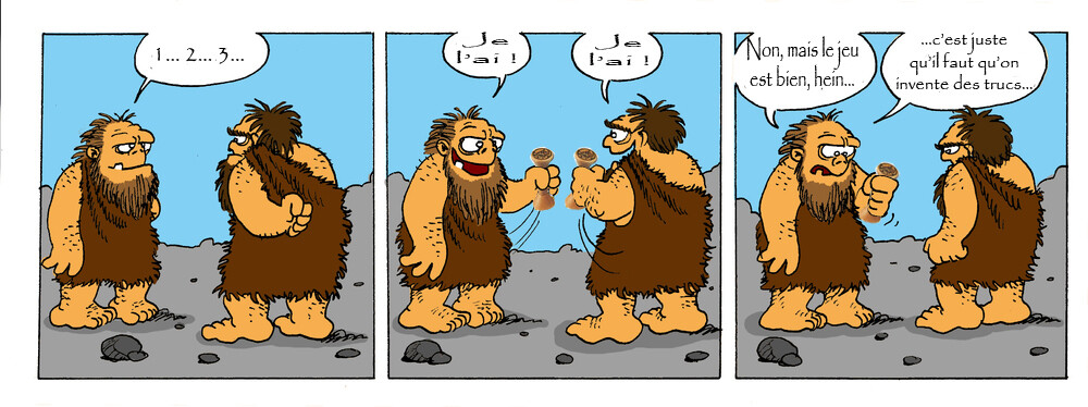 Fig. 1 : Gédéon, probable inventeur originel du JUNGLE SPEED, taillant un silex pour le rendre identique (Identique à quoi? Il ne le savait surement pas encore).