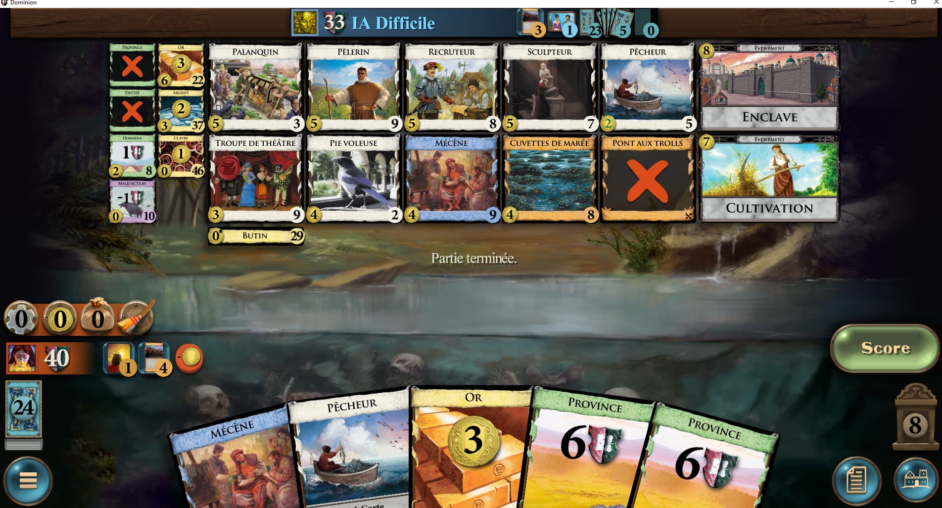 La partie du jour, totalement “débile” puisque Troupe de Théatre vient avec un butin et qu’on commence la partie avec 7 Butin à la place des Cuivre. Avec 3 cartes qui donnent des villageois et des Pont aux trolls, les parties sont pliées en moins de 10 tours. C’est drôle, mais c’est un peu facile ![]()