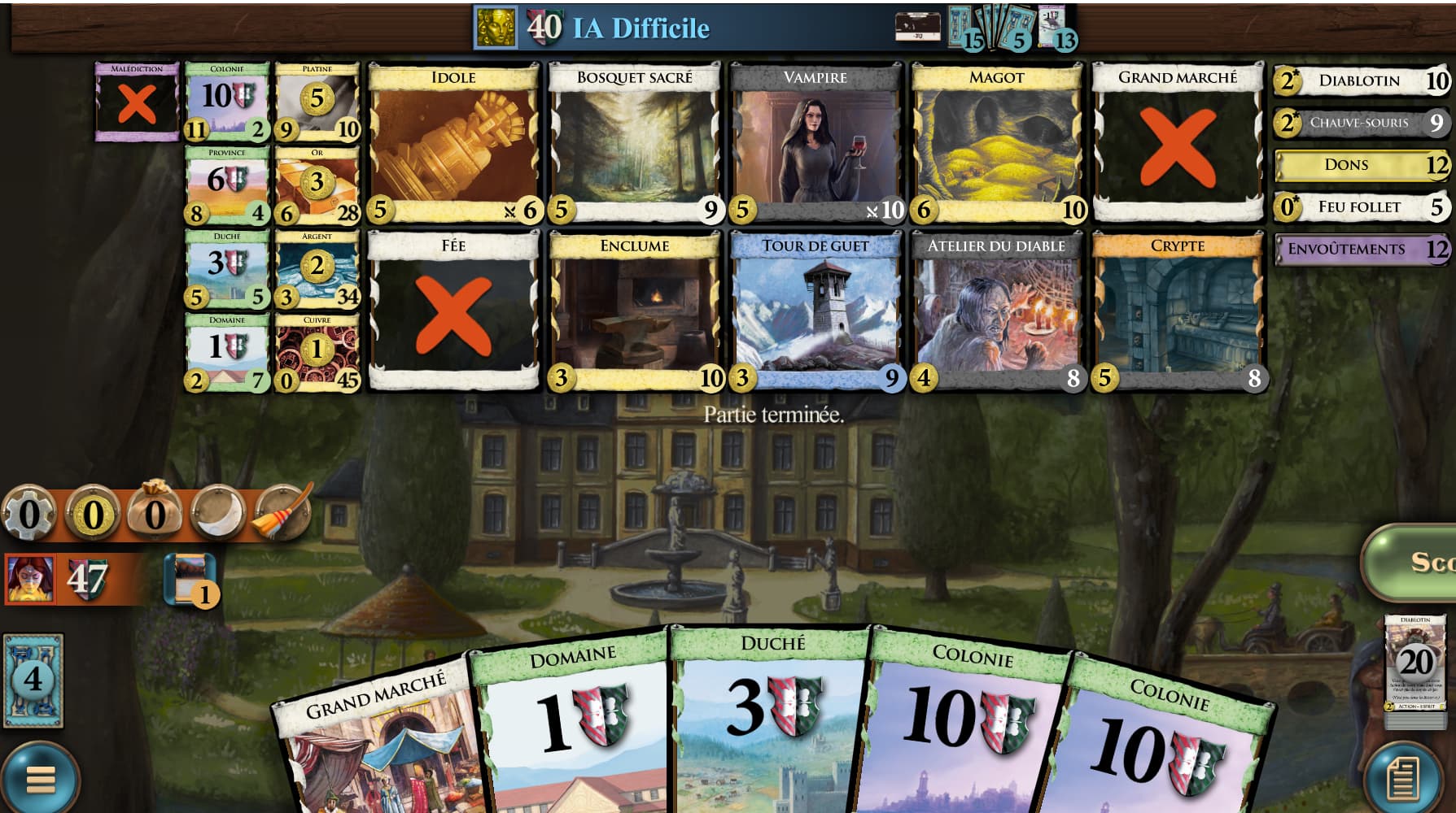 Une partie Nocturne aujourd’hui. Je me suis pris quelques branlées (contre Hard AI), mais j’en ai gagné quelques unes. L’IA joue à fond la Fée même si elle les fait beaucoup tourner. Perso, j’ai beaucoup joué avec Nocturne. Ouverture avec Atelier du diable pour choper rapidement de l’Or et pouvoir prendre des Grand Marché. Vampire comme première carte à 5 (l’IA est plutôt sur l’Idole). Le Vampire permet de choper Idole et Crypte qui sont très forte et complémentaire. Il permet aussi de faire chier un peu l’autre et d’épurer le deck dans sa phase Chauve-souris. Il peut prendre quelques Duché en fin de partie. En plus, il permet de prendre plus de cartes pour activer Diablotin sur Atelier du diable. Diablotin qui se révèle très fort sur cette partie. La course aux Platine est quand même importante même si on a attaqué assez vite les points sur cette dernière et que je gagne en achetant les dernière Malédiction. J’ai bien aimé cette partie que j’ai rejoué plusieurs fois avec plaisir.