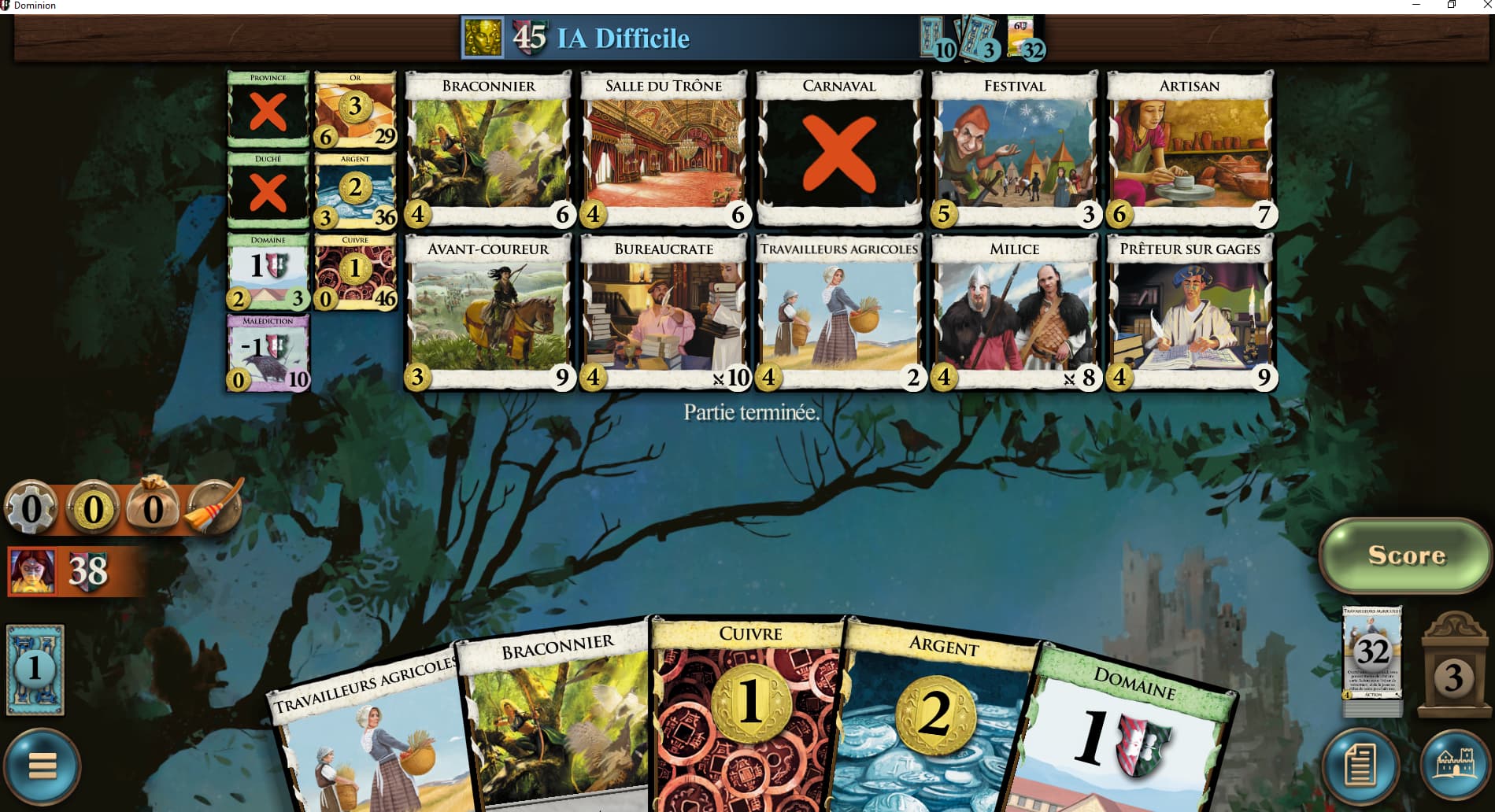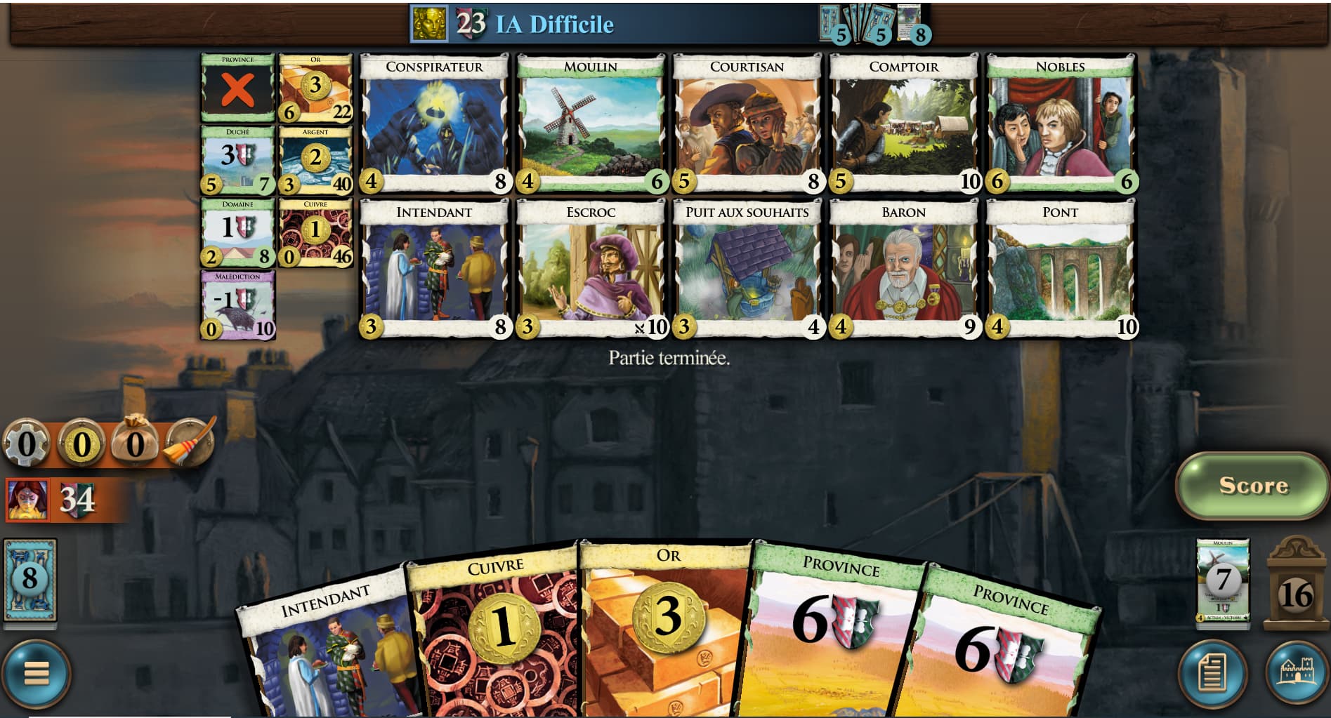 pareil aussi, les 3 cartes Moulin, Nobles et Courisan combinent bien ensemble, victoire facile (en IA moyenne aussi). Intriques n’est pas le set de cartes qui me passionnent le plus.