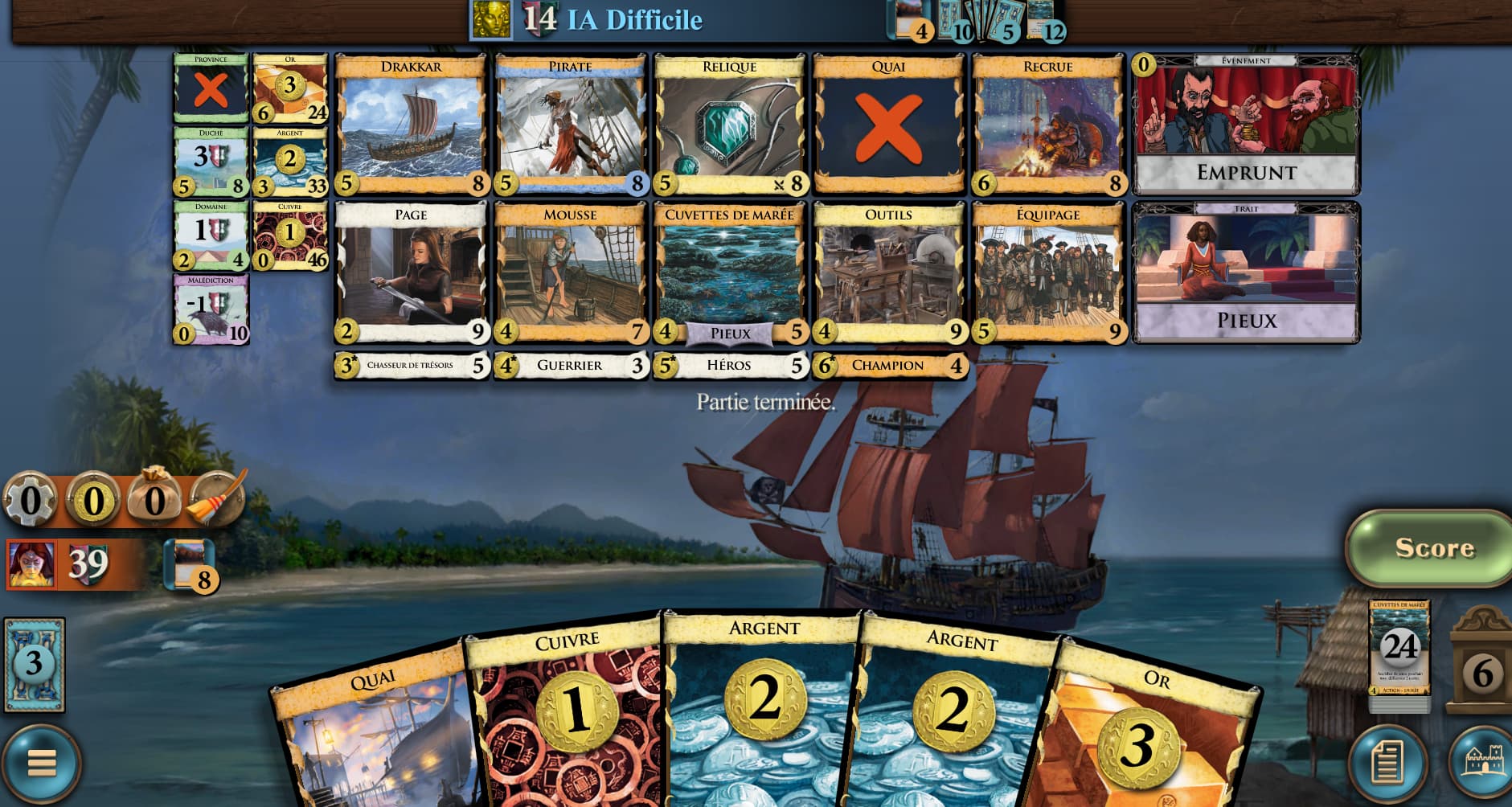 J’ai tout le temps joué la même technique. J’ai perdu à chaque fois au départ, avant d’enchaîner 3 ou 4 victoires. Ouverture en Cuvette des marée/Page, le but étant d’aller chercher le plus vite possible la Championne, pour enchaîner les Quai. Le petit truc que j’ai changé, c’est de prendre plutôt Outils que Mousse (mais si le 2° 4 thunes vient très rapidement, Cuvettes des marées parait mieux pour optimiser l’arrivée de la Championne. Et, pour le premier 5, je suis plutôt allé sur Pirate que sur Quai pour éviter un piocheur terminal qui peut ralentir l’arrivée de la Championne tout en ramenant de l’Or dans le deck (et éventuellement une Relique. Les outils chope plutôt Recrue qui est mieux que Quai en début de partie. Ne pas oublier l’Equipage qui peut assurer une rotation du deck très efficace quand la Championne est là.