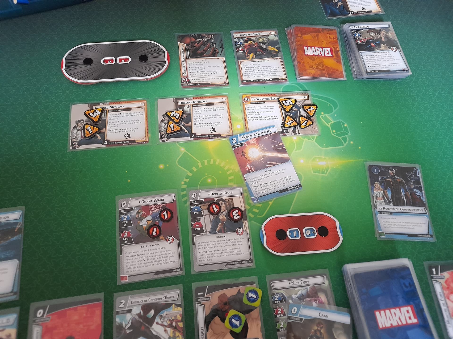 Une petite pause le temps de reprendre mes esprits, et je repars au combat. Cette fois, je prends le temps de bien mesurer chaque menace, et je déroule mon jeu méticuleusement. Mes decks tournent très bien, et j’ai presque toujours les bons outils à disposition : même avec l’affinité Agressivité, Captain Marvel est capable de contrer régulièrement grâce à son CTR boosté à 3 (avec Instinct Héroïque donné par Miss Hulk) et Empêcher les conflits, sans oublier Poursuivons-les, très efficace sur ce scénario ; de son côté, Miss Hulk peut aussi bien éliminer les sbires (ah, cette ATQ 6 !