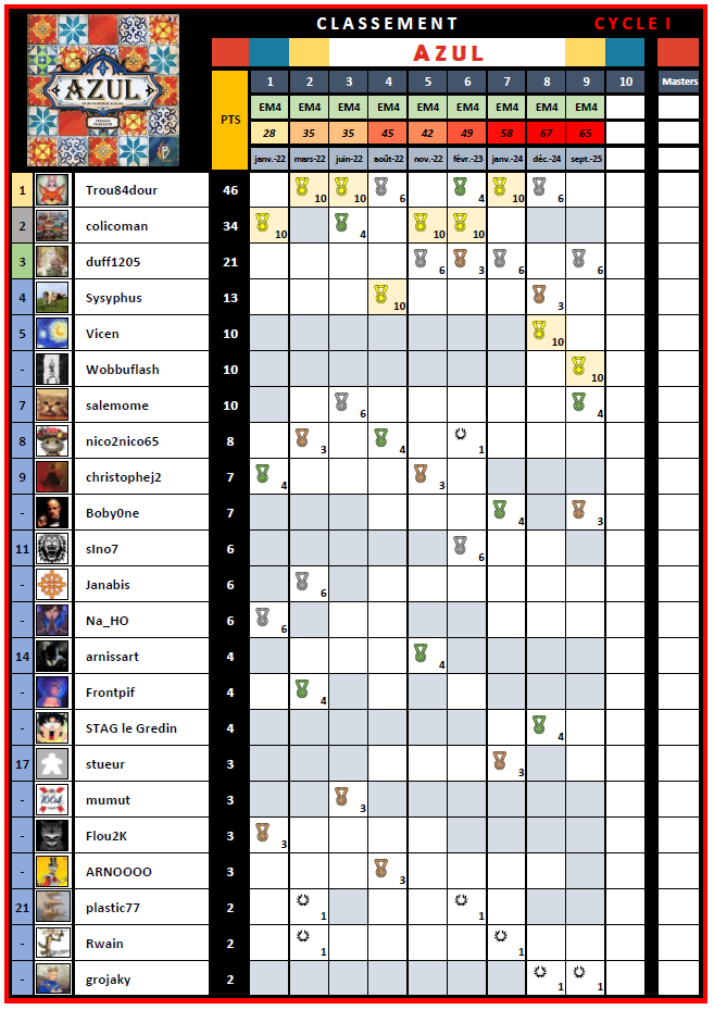 Ainsi, un tournoi avec 50 ou plus participants aura le barème le plus élevé alors qu’un tournoi avec moins de 17 participants aura le barème le plus faible. - Prise en compte uniquement des 12 meilleurs résultats pour permettre à davantage de trictraciens de bien figurer dans le classement.