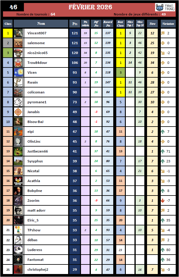 Maintenant, voici le classement de FÉVRIER 2026, sans doute le classement le plus serré de l’histoire puisque les 3 premiers sont seulement séparés d’un seul point. Et, pour la 5ème fois de sa carrière, Vincent007accède à la plus haute marche du podium devant salemome et nico2nico65 qui perd sa place de leader.