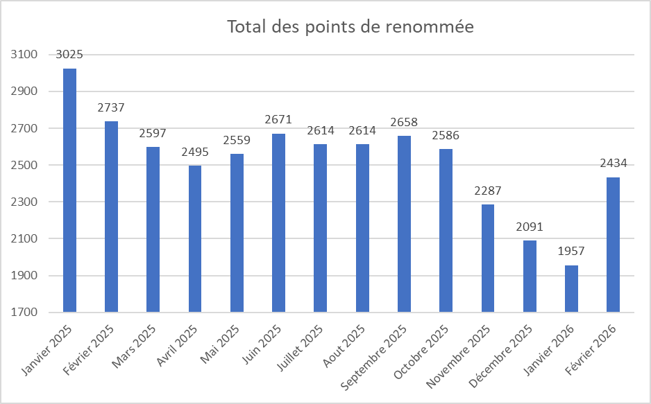 Avec 28 jours de retard, je vous fait enfin le point sur le classement de février 2026, qui prend en compte tous les résultats du 01/02/2025 au 31/01/2026.