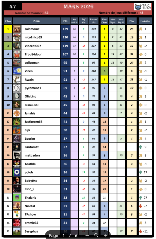 Pour nico2nico65 (n°7) par contre, la situation est plus tendue, avec seulement 13 pts, il est loin des deux places qualificatives actuellement occupées par Elric_S (29 pts) et leyeye (26 pts). Assistera-t-on à une demi-finale sans aucun membre du top10 pour ce dernier tournoi du cycle 1 ?