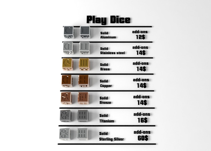 Les dés son disponible en plusieurs matériaux aluminium, stainless steel, bronze, laiton, titanium, et argent sterling!