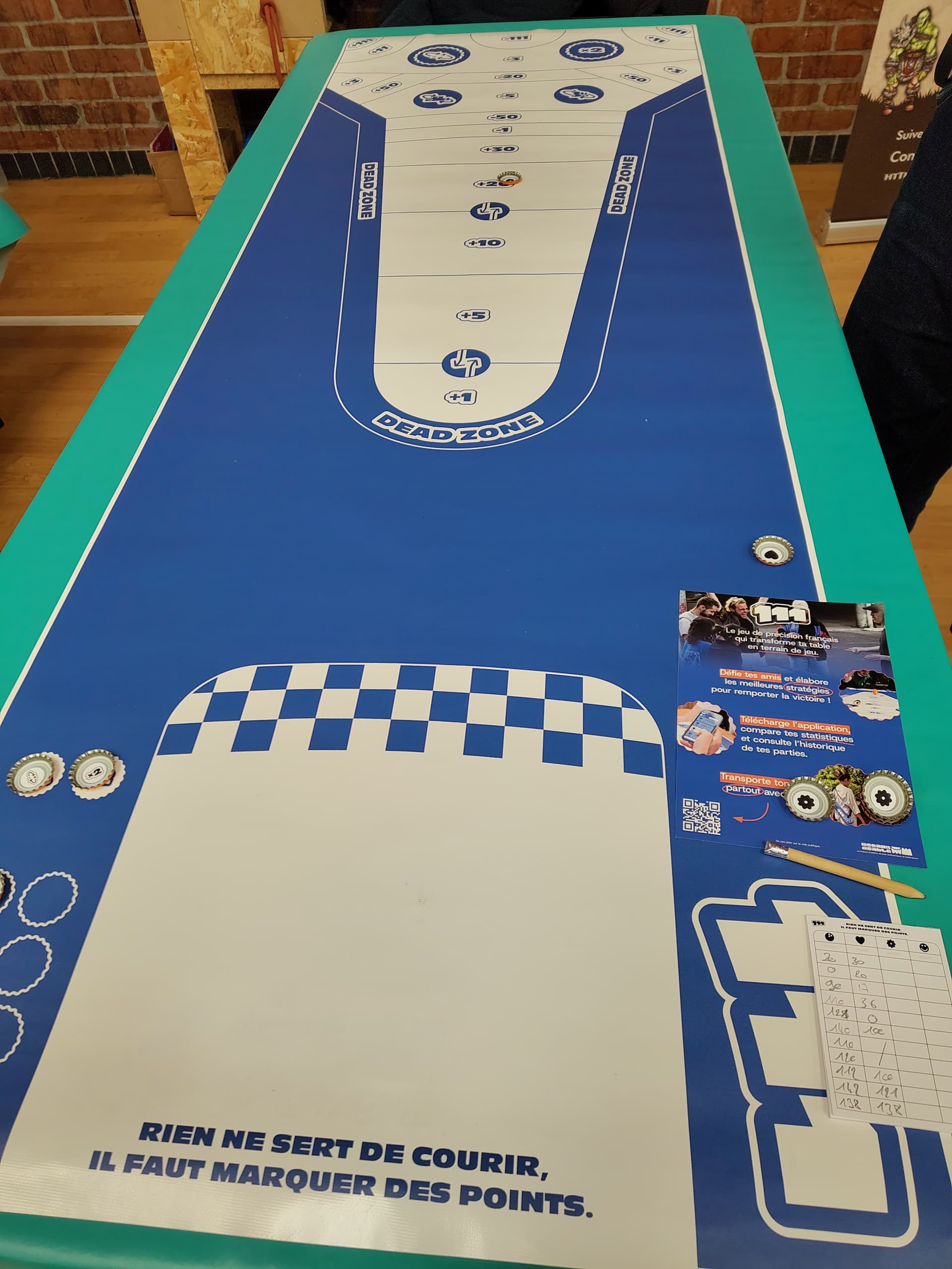 Un jeu de pitch de type lancer de palets sur une piste avec des zones numérotées qui rapportent ou retirent des points. İl faut arriver pile à 111 ou avoir le plus de points au bout de 11 manches. İl y a des cases qui déclenchent des effets rigolos. C’est classique mais ça marche bien. Je souhaite de la réussite aux jeunes qui ont lancé ce projet. Ah oui, les palets sont des capsules de bière, on imagine dans quel genre de soiree l’idée du jeu a du germer ![]()