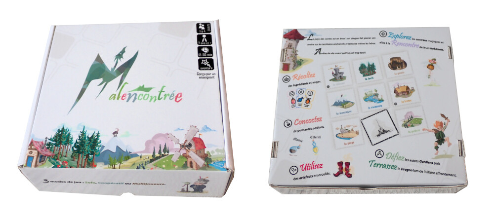 Malencontrée est un jeu familial fabriqué en France (Ardèche) avec des matériaux de qualité. Les règles ont été conçues pour autoriser différents modes de jeu (solo, multi, coop), garder le suspens jusqu’à la fin et offrir également une grande rejouabilité.