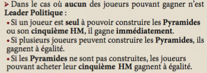3) Si les Pyramides ne sont pas construites, un joueur pouvant acheter son 5e H/M gagne ; s’ils sont plusieurs il gagnent à égalité.